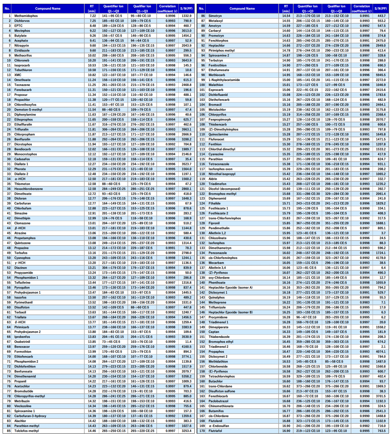 Sample Concentration : Pesticide mixed standard solutions were prepared at 5, 10, 20, 50, and 100ppb