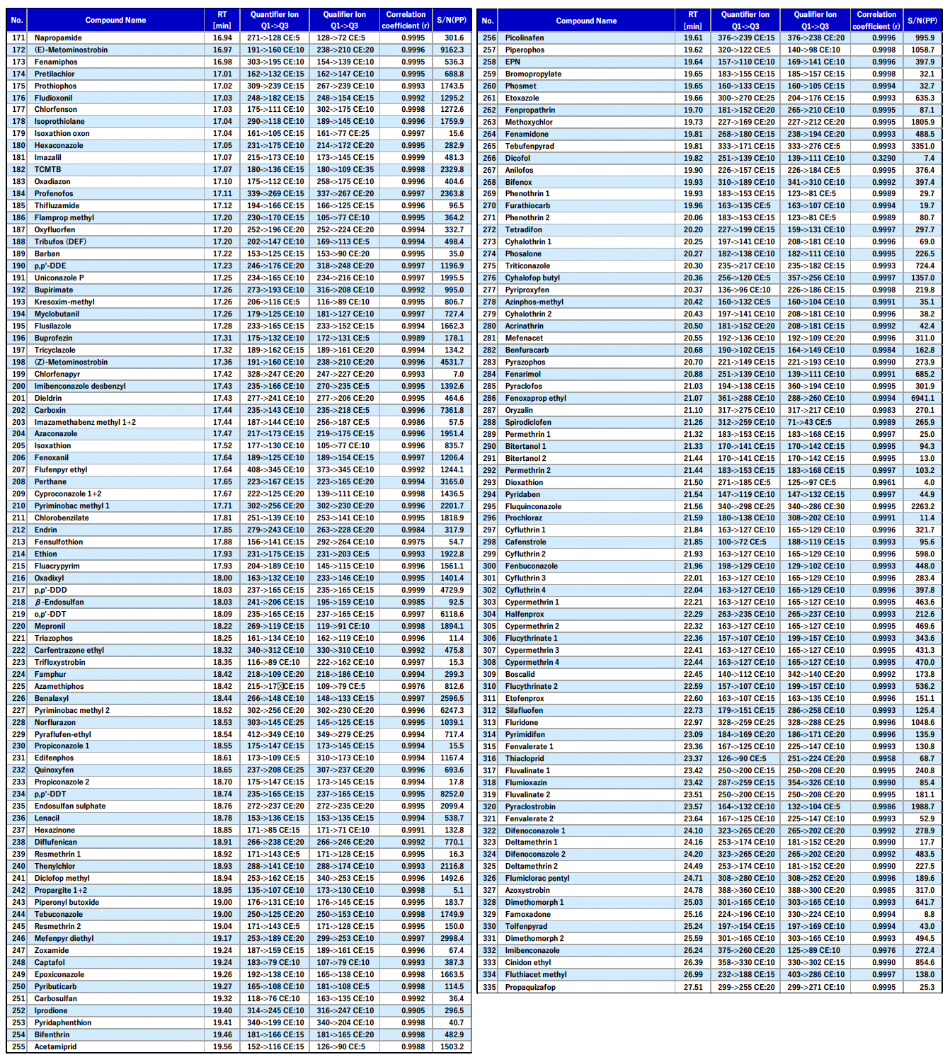 As an application example of simultaneous analysis of residual pesticides in food using GC-MS/MS with nitrogen carrier gas, measurement conditions were examined, and a calibration curve was created in the range of 5 ppb to 100 ppb by measuring a mixed pesticide standard solution. Out of the 335 pesticide components set as measurement targets, 328 components could be detected without any issues down to 5 ppb. This resulted in a favorable outcome, indicating that 98% of the pesticide compounds examined could be quantified using nitrogen carrier gas. This result was almost equivalent to the findings reported in MSTips No. 394, which used hydrogen carrier gas. When comparing the detection sensitivity of various alternative carrier gases, it is generally said that hydrogen is more sensitive than nitrogen. However, by thoroughly optimizing the measurement conditions to match the carrier gas used, it was confirmed that sufficient sensitivity for analysis could be achieved even when using nitrogen carrier gas.