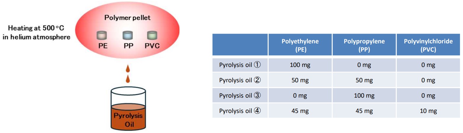 The pyrolysis oil sample was produced by mixing polyethylene (PE), polypropylene (PP), and polyvinyl chloride (PVC) pellets, then heating at 500°C for 15 minutes in a helium atmosphere. Figure 1 shows a schematic diagram producing pyrolysis oil a table of polymer pellet amount. The generated pyrolysis oil was washed away with chloroform and collected, and 1 μL of the diluted oil was injected into GC.