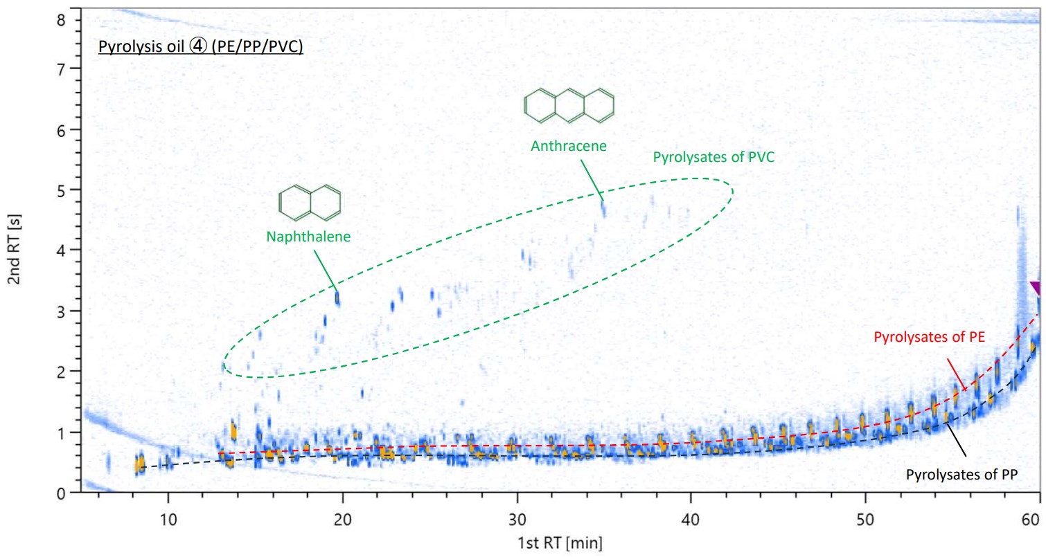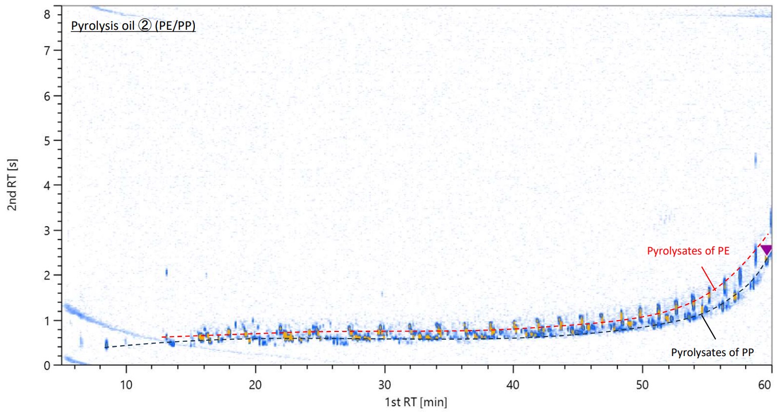 Figure 2 shows the 2D chromatograms of pyrolysis oils ② (PE/PP) and ④ (PE/PP/PVC). In addition to the main components, the pyrolysates of PE/PP, trace components such as naphthalene and anthracene, which are the pyrolysates of PVC, could also be easily confirmed in the 2D chromatogram.