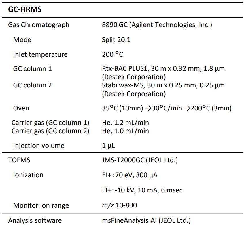 As a GC column, Rtx-BAC PLUS1 and Stabilwax-MS were used because polarity components similar to IPA were expected to be impurities. EI and FI (Field Ionization) were used as ionization methods. msFineAnalysis AI was subsequently used for analysis of the acquired data. Table 1 shows the measurement conditions.