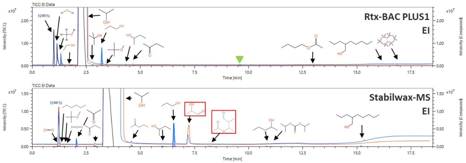 Figure 1 shows the total ion current chromatograms (TICCs) obtained with GC column 1 and GC column 2. In the figure, the TICC of Sample A is marked by blue while the TICC of Sample B is marked by red respectively, showing the compound structures estimated by msFineAnalysis AI. The compound structures framed in red were estimated by the AI database because their formulas predicted from the molecular ions did not agree with the results of NIST compound search.