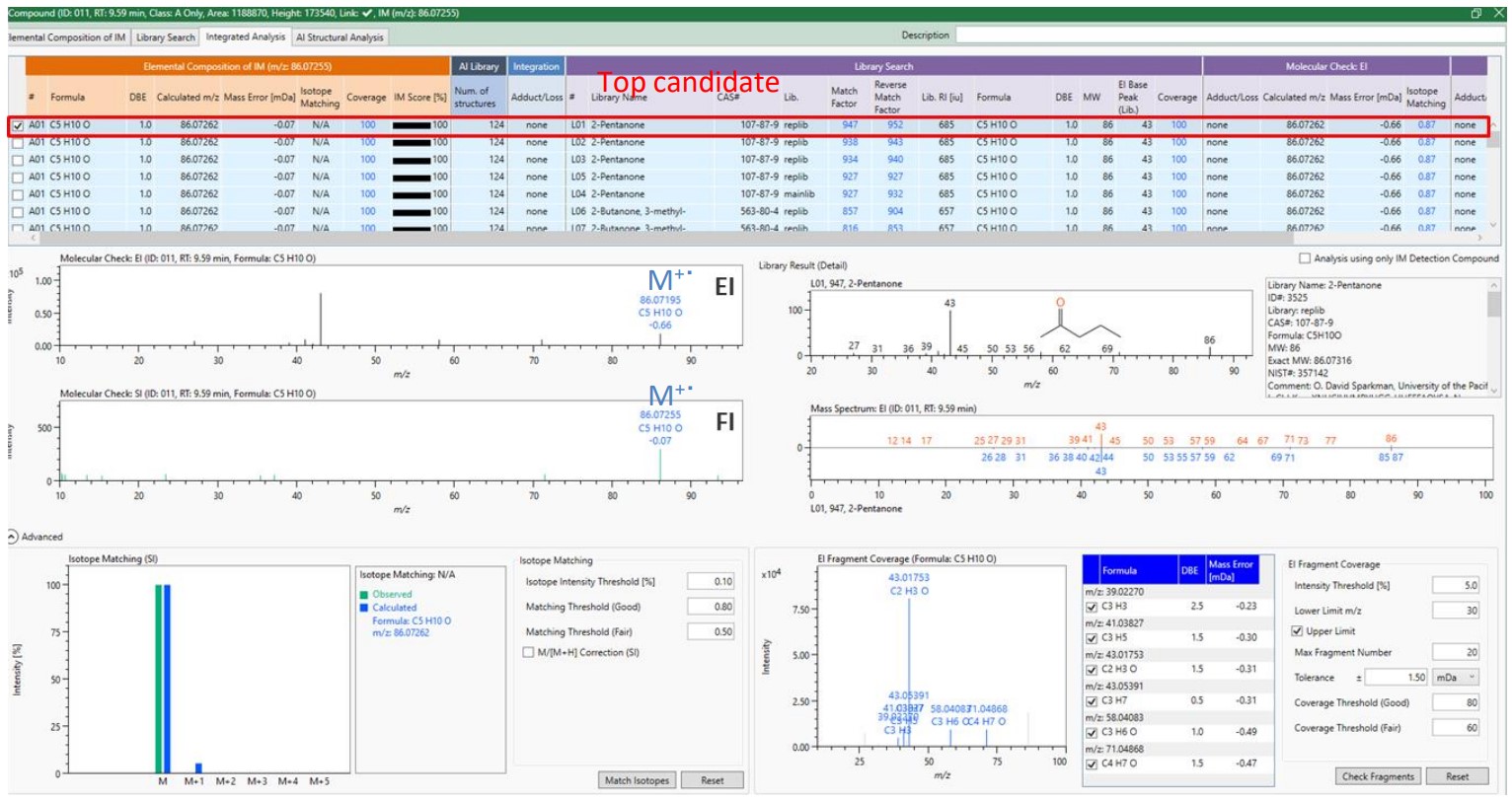 In Figure 2, the EI mass spectrum mostly detected a fragment ion while the FI mass spectrum detected a molecular ion as a base peak. The exact mass of the molecular ion detected suggested C5H10O as its chemical formula. The suggested chemical composition of the major EI fragment ion was also consistent to the chemical formula of the molecular ion. The NIST database search resulted in 2-pentanone as the highest degree of similarity. msFineAnalysis AI presented 2-pentanone as a compound candidate because the chemical composition of 2-pentanone agrees with the chemical composition calculated from the exact mass.