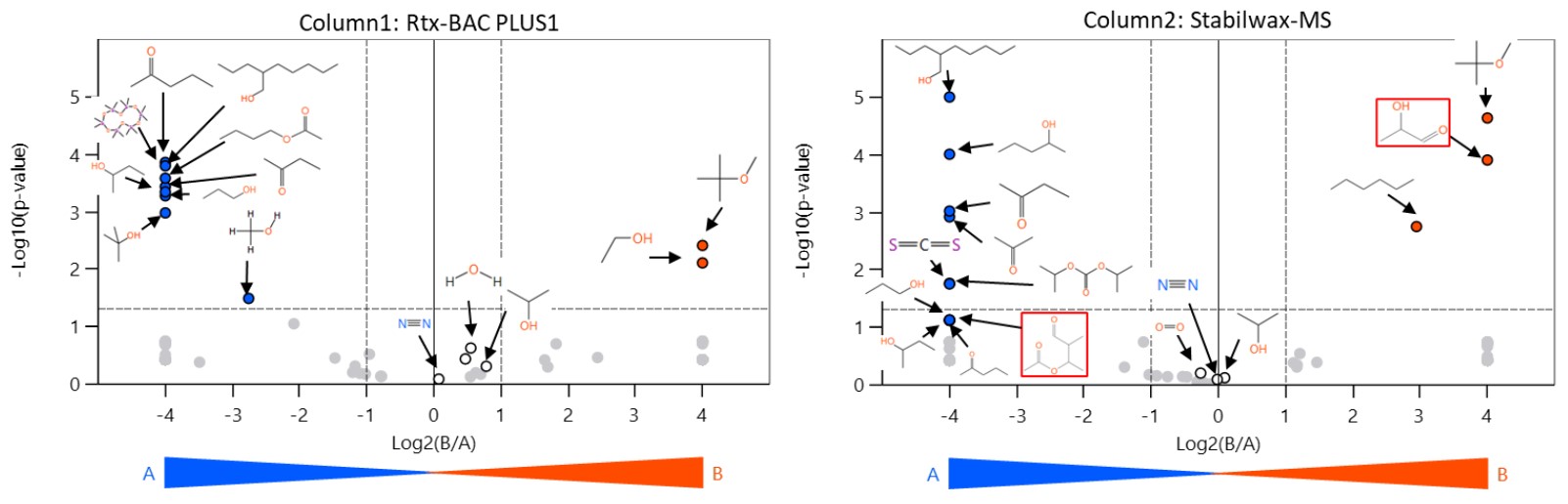 Figure 3. Volcano plots using different GC column data