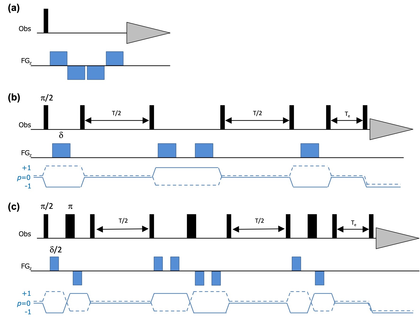 Figure 2 Compensating thermal convection by double echo: (a) double gradient echo, (b) DSTE: Delta V6 - dste_led_diffusion.jxp, (c) BPP-DSTE: Delta V6 - bpp_dste_led_diffusion.jxp, Delta V5 - bpp_dste_led_dosy_pfg.jxp. 'p' represents the selected coherence order.