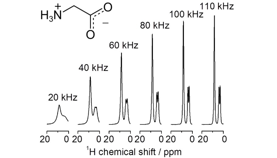 In solid-state NMR, interactions such as dipolar couplings and chemical shift anisotropy often result in extremely broad and low-sensitivity spectra in the stationary state. To address this issue, the sample is tilted at an angle of 54.74 degrees relative to the magnetic field and spun rapidly, creating a state similar to that of a solution. This technique, called MAS (Magic Angle Spinning), improves both resolution and sensitivity. For experiments observing 13C, a spinning speed of a few kHz is sufficient to average out heteronuclear dipolar interactions between 1H and 13C, and combined with 1H decoupling, spectra suitable for analysis can be obtained. However, homonuclear dipolar interactions, such as those between 1H nuclei, are stronger and require even higher spinning speeds for effective averaging. Recent advances in hardware have enabled spinning speeds exceeding 70 kHz, making 1H spectra useful for analysis in solid-state NMR. Figure 1 illustrates one-dimensional spectra of glycine acquired at spinning speeds ranging from 20 kHz to 110 kHz, demonstrating how high-speed spinning achieves higher resolution and sensitivity. This article presents an example of detailed structural analysis of histidine hydrochloride monohydrate using ultrafast MAS.