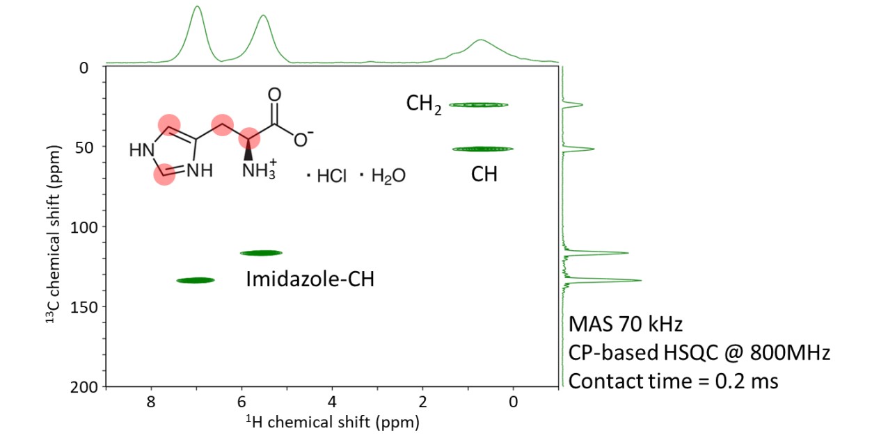 By acquiring a 1H-13C correlation spectrum, information about the proximity between 1H and 13C nuclei can be obtained. Figure 3 shows the 1H-13C HSQC spectrum. Here, the transfer of magnetization from 1H to 13C was achieved using the Cross Polarization (CP) method. To detect signals corresponding to direct CH bonds, the contact time for magnetization transfer was set to 0.2 ms. The spectrum reveals signals for two imidazole CH, aliphatic CH and CH2 groups, demonstrating that the aliphatic CH and CH2 signals overlapped in the one-dimensional 1H spectrum. Additionally, by increasing the contact time, it is possible to observe correlation signals over longer distances.