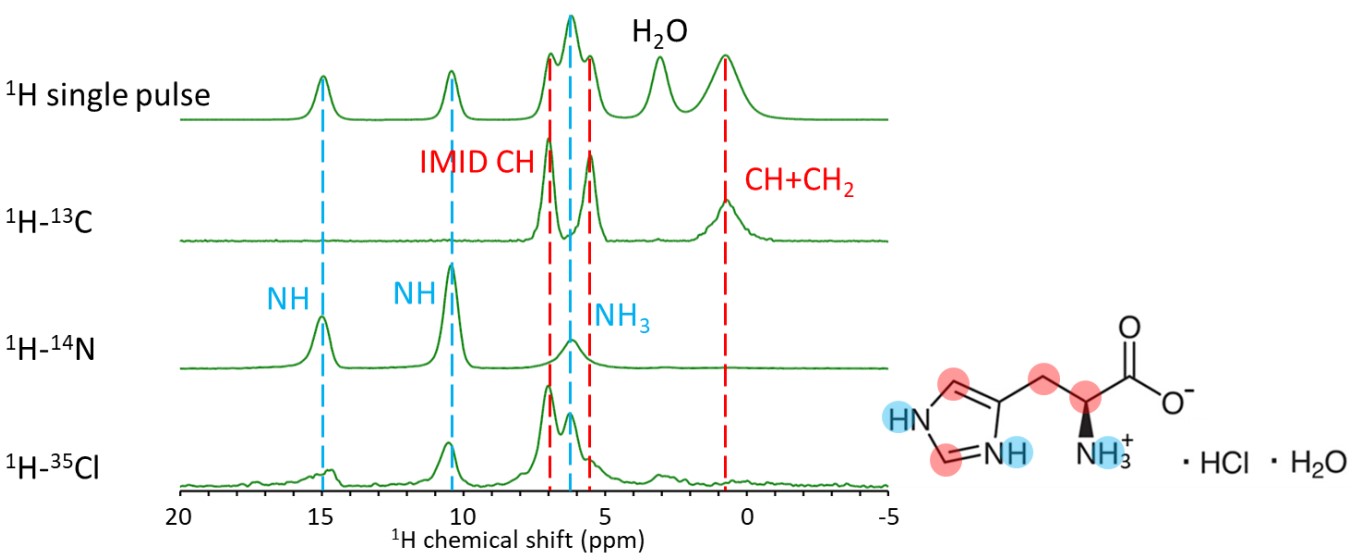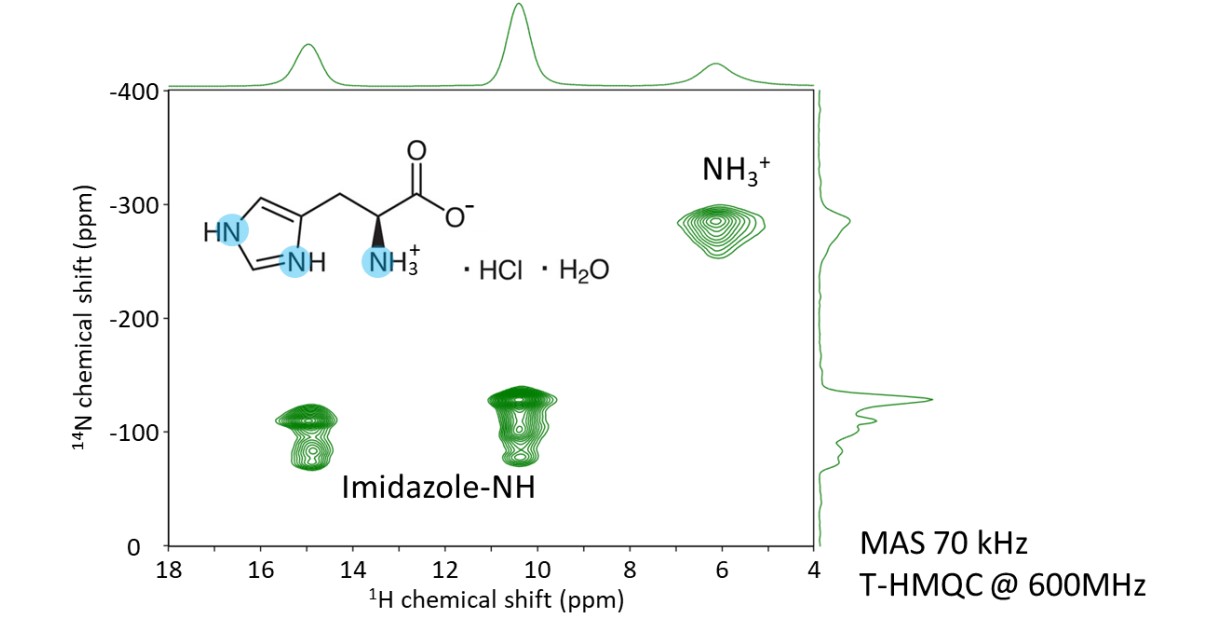 By acquiring a 1H-14N correlation spectrum, information about the proximity between hydrogen and nitrogen atoms can be obtained. Figure 4 shows the 1H-14N T-HMQC spectrum. The interpretation of this spectrum is similar to that of the 1H-13C HSQC spectrum, but here, the transfer of magnetization from 1H to 14N was achieved using a different method called TRAPDOR. Three signals were detected: one corresponding to the NH3+ group and two signals corresponding to the NH groups in the imidazole ring.