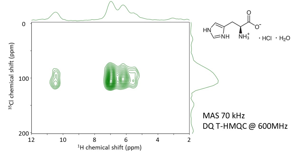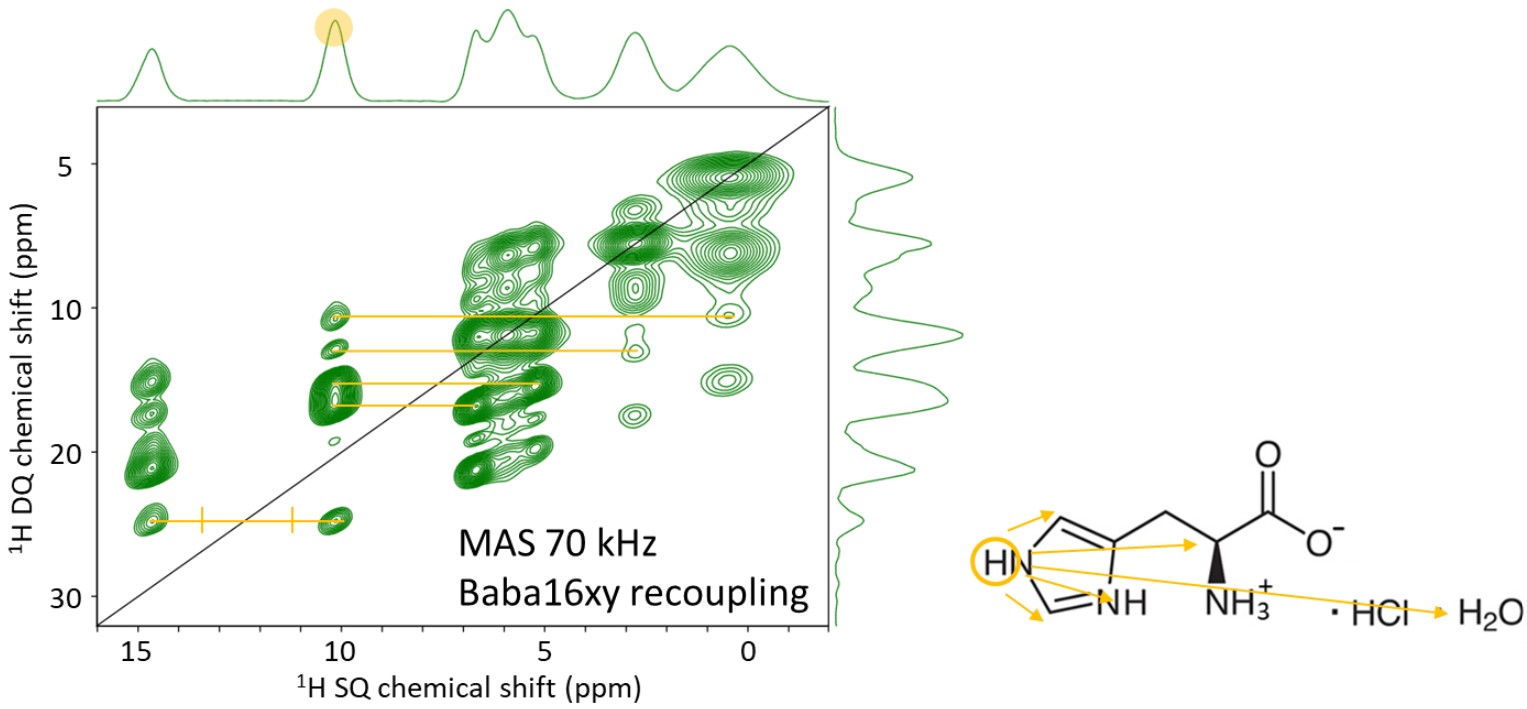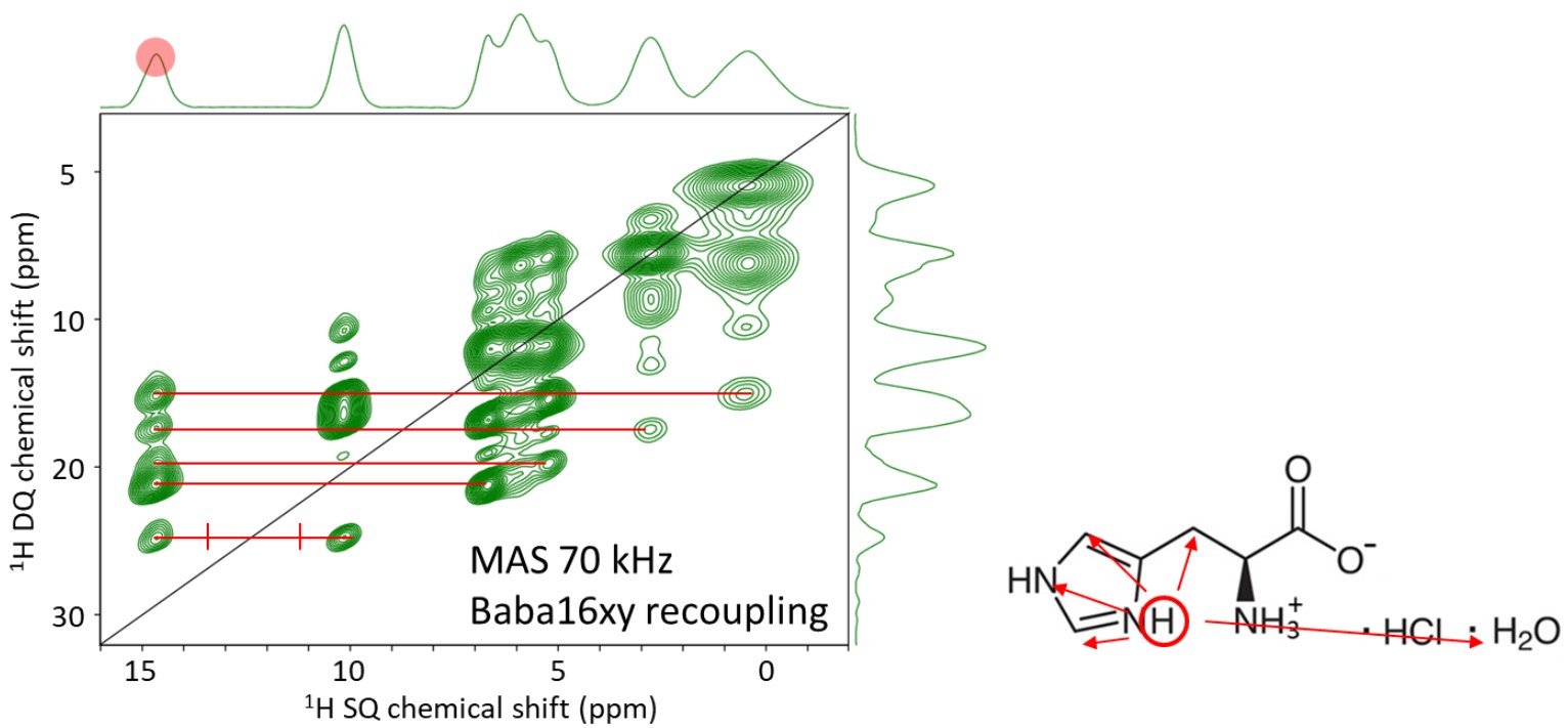 Figure 7 | 1H DQMAS spectrum of Histidine hydrochloride monohydrate. A detailed analysis was performed on the two imidazole NH groups.