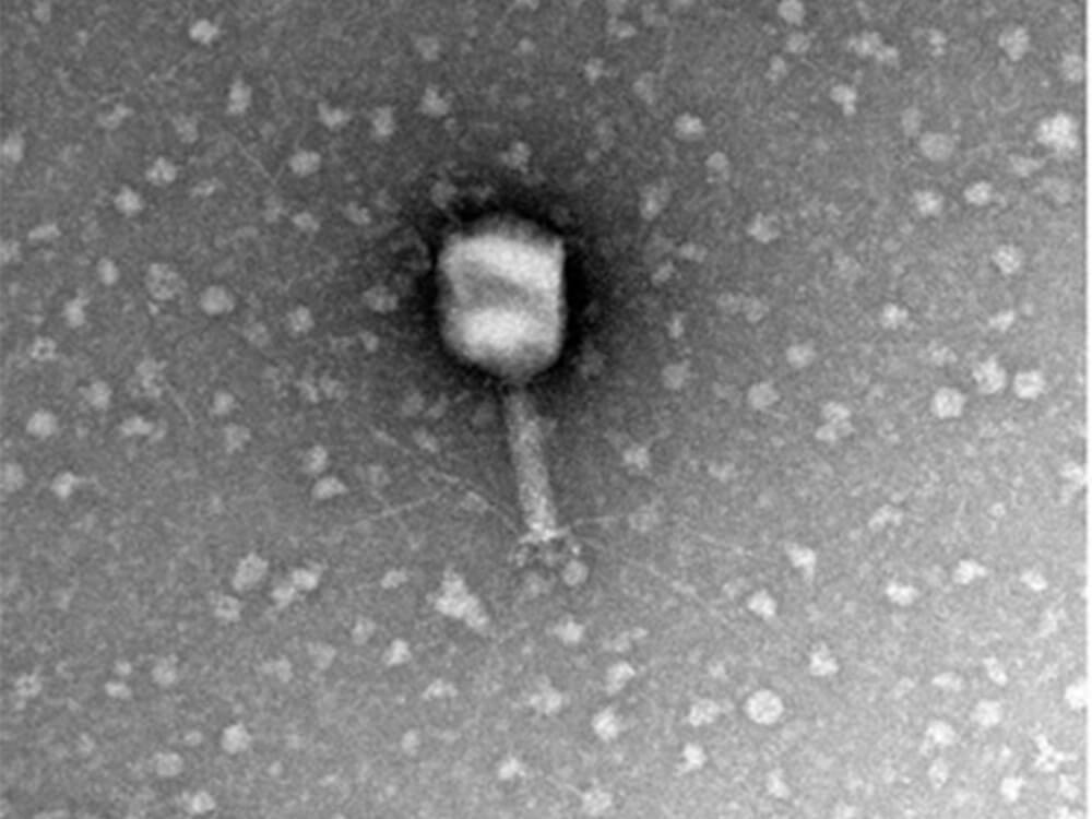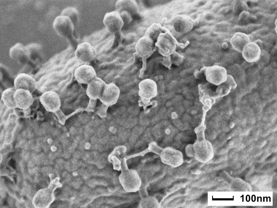 Since we observed at an ultra-low landing voltage of 0.4 kV, the bacteriophage T4 adsorbed to the Escherichia coli can be observed without the electron beam penetrating the sample.