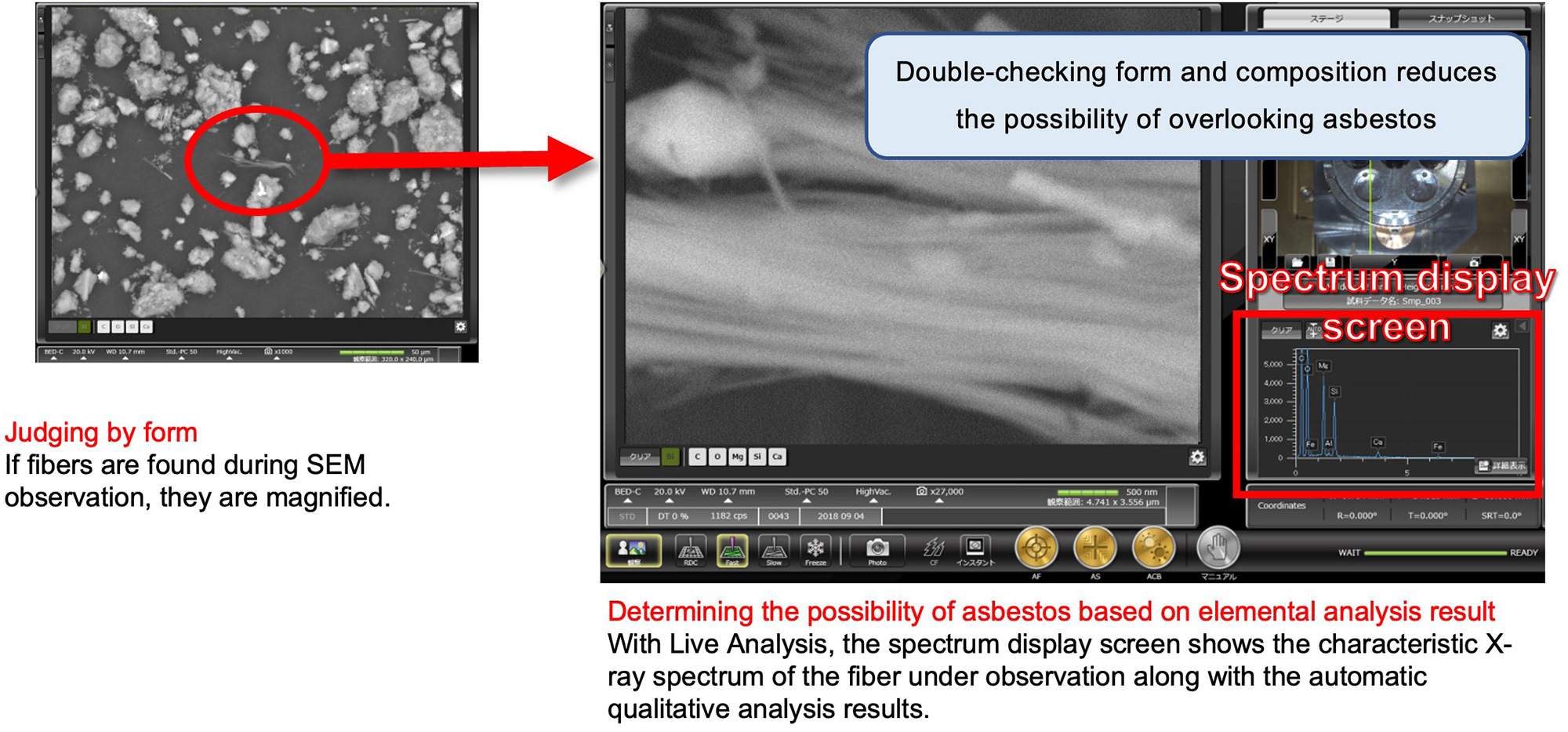 If the presence of asbestos in a building scheduled for demolition cannot be determined, it is necessary to analyze building materials that may contain asbestos. Typically, a polarized optical microscope (POM) is used. However, for samples that are difficult to identify, an SEM (scanning electron microscope) or TEM (transmission electron microscope) is used to confirm. Compared to repeating the pretreatment process or re-examining with POM, these methods allow for more efficient verification and provide highly reliable data.