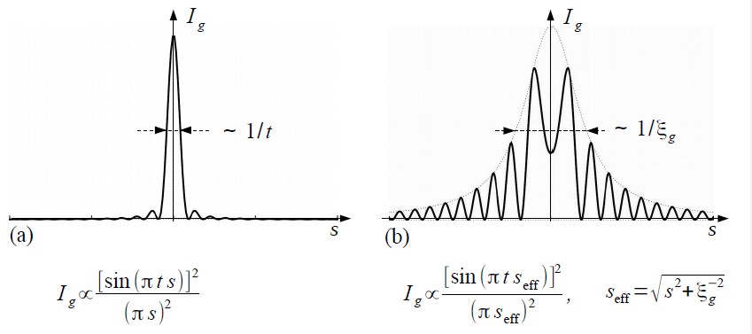 Fig. 1 (a) Rocking curve of a diffracted wave due to kinematical diffraction. (b) Rocking curve of a diffracted wave due to dynamical diffraction. The symbols t, s, and ξg respectively stand for specimen thickness, deviation parameter (excitation error) from a Bragg condition, and extinction distance. The intensity equations of the diffracted wave which are obtained respectively by kinematical diffraction and dynamical diffraction, are given under the figures (a) and (b). (reprinted from M. Tanaka, M. Terauchi, K. Tsuda, “Introduction to Electron Diffraction and Elementary Crystallography” (in Japanese), Kyoritsu Printing Co., Ltd., 2014)