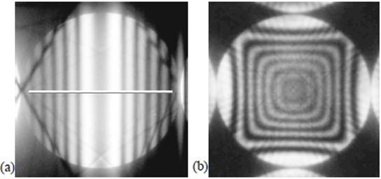 Fig. 2 (a) Rocking curve of the 220 reflection of Si taken under the two-wave approximation condition. The intensity curve traced along the center horizontal line agrees well with the curve shown in Fig. 1(b). The obliquely running dark lines seen at the periphery originate from the other reflections. (b) CBED pattern of the 000 transmitted wave taken at the [100] zone axis incidence. Two orthogonal rocking curves are seen in the vertical and horizontal directions. A four-fold rotational symmetry is clearly seen. (reprinted from M. Tanaka, M. Terauchi, K. Tsuda, “Introduction to Electron Diffraction and Elementary Crystallography” (in Japanese), Kyoritsu Printing Co., Ltd., 2014)