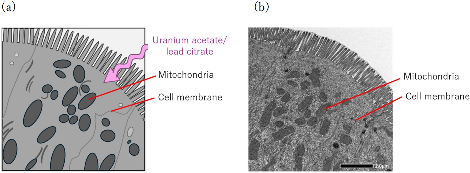In the case of a biological specimen, uranium (uranyl acetate) and/or lead (lead citrate) are adsorbed to proteins, lipids, polysaccharides and nucleic acids in the specimen. As a result, organelles such as nuclei (chromatins), mitochondria and ribosomes in the cells, and cell membranes, which are composed of these components are stained, whereas other regions remain unstained. Consequently, the TEM images of these organelles can be observed with high contrast. Fig. 1 shows an observation example of intestinal epithelial cells.