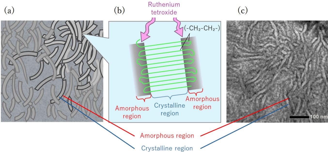 Fig. 2. (a) Schematic illustration of electron staining for the amorphous regions of polyethylene using RuO4. The amorphous regions on the surface of polyethylene are stained with ruthenium and observed dark, whereas the crystalline regions remain unstained and are observed light. (b) Schematic illustration of the crystalline regions inside the polyethylene and the amorphous regions on its surface. (c) TEM image of the polyethylene stained with RuO4. The amorphous regions on the surface are stained and clearly seen dark.